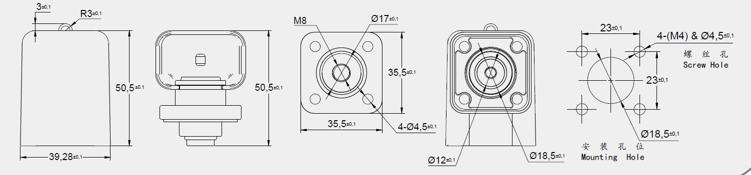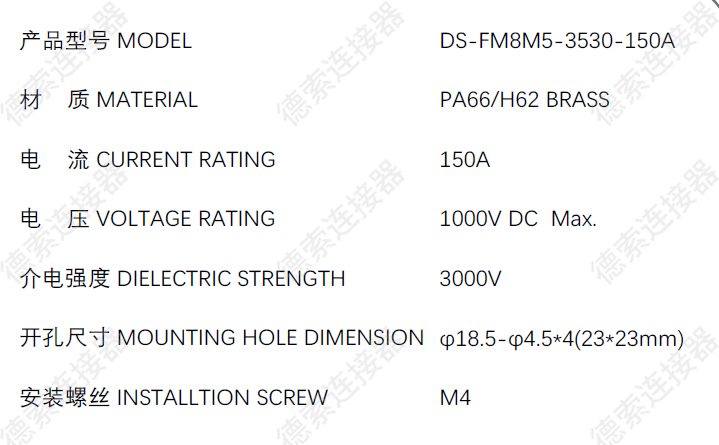 料号: DS-FM8M5-EB-3530-150A-C 标签: 150A,螺纹端子,穿墙式 其他: 提供尺寸、材质调整服务(定制打样)
